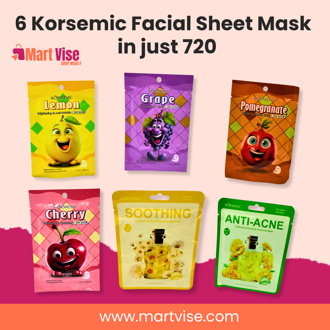 Pamper your skin with the Korsemic Facial Sheet Mask Pack of 6, a perfect skincare solution for Pakistani weather and lifestyle. This combo includes six unique variants: Lemon for brightening, Grape for anti-ageing, Pomegranate for radiance, Cherry for hydration, Chamomile Soothing for calming, and Calendula Anti-Acne for clear skin. Whether you’re dealing with heat, dust, or dullness from city life, these masks provide quick hydration and nourishment in just 15 minutes. Affordable and effective, this set is ideal for students, professionals, and anyone looking to refresh their skin without spending on expensive facials. With cash on delivery available across Pakistan, you can enjoy salon-like skincare at home .