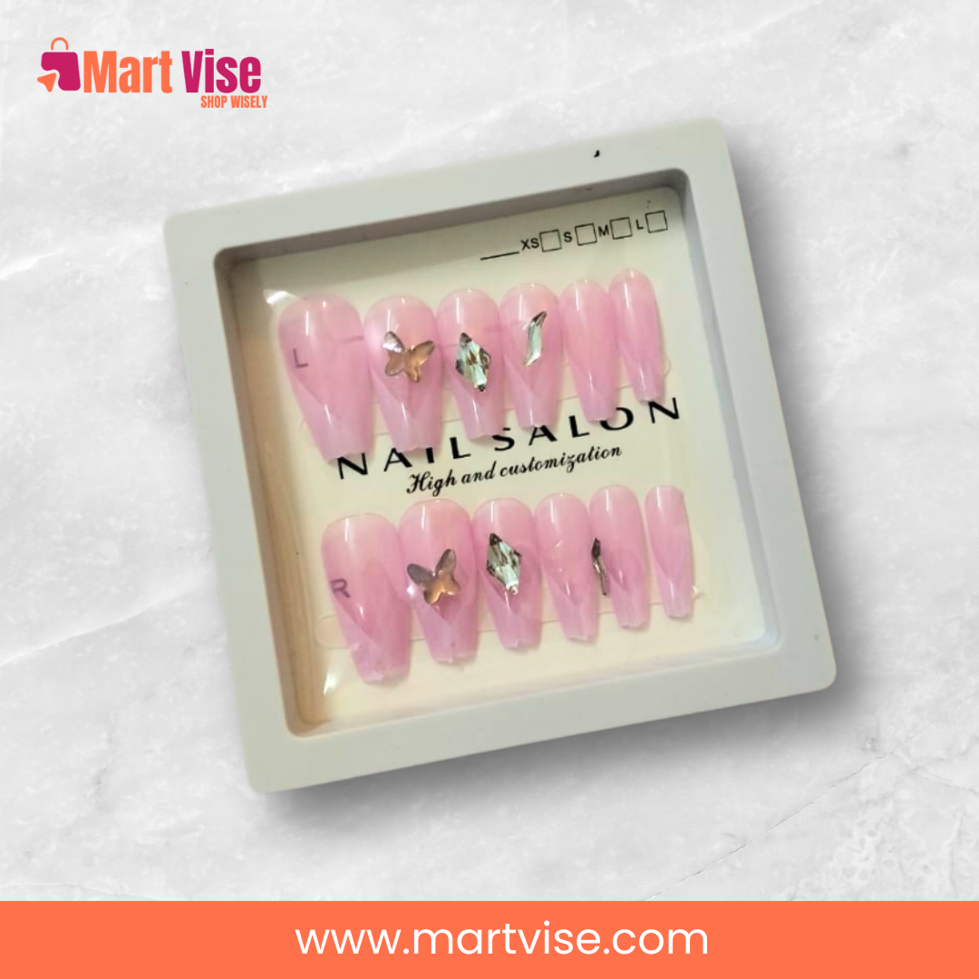 Add instant glamour to your look with the Artificial Nail Set 2 – Soft Pink Butterfly Nail Art Collection. Designed for style lovers, this beautiful press-on nail set features a soft pink base decorated with delicate butterfly and crystal accents. Whether you’re preparing for a party, wedding, or casual outing, these nails give you a salon-quality finish at home. Lightweight, reusable, and easy to apply with self-adhesive stickers or nail glue, they’re perfect for busy Pakistani women who love staying stylish without spending hours in a salon. The durable acrylic build ensures long-lasting shine and comfort, while the natural curve gives a flawless, professional look. Available now with fast cash-on-delivery service across Pakistan.