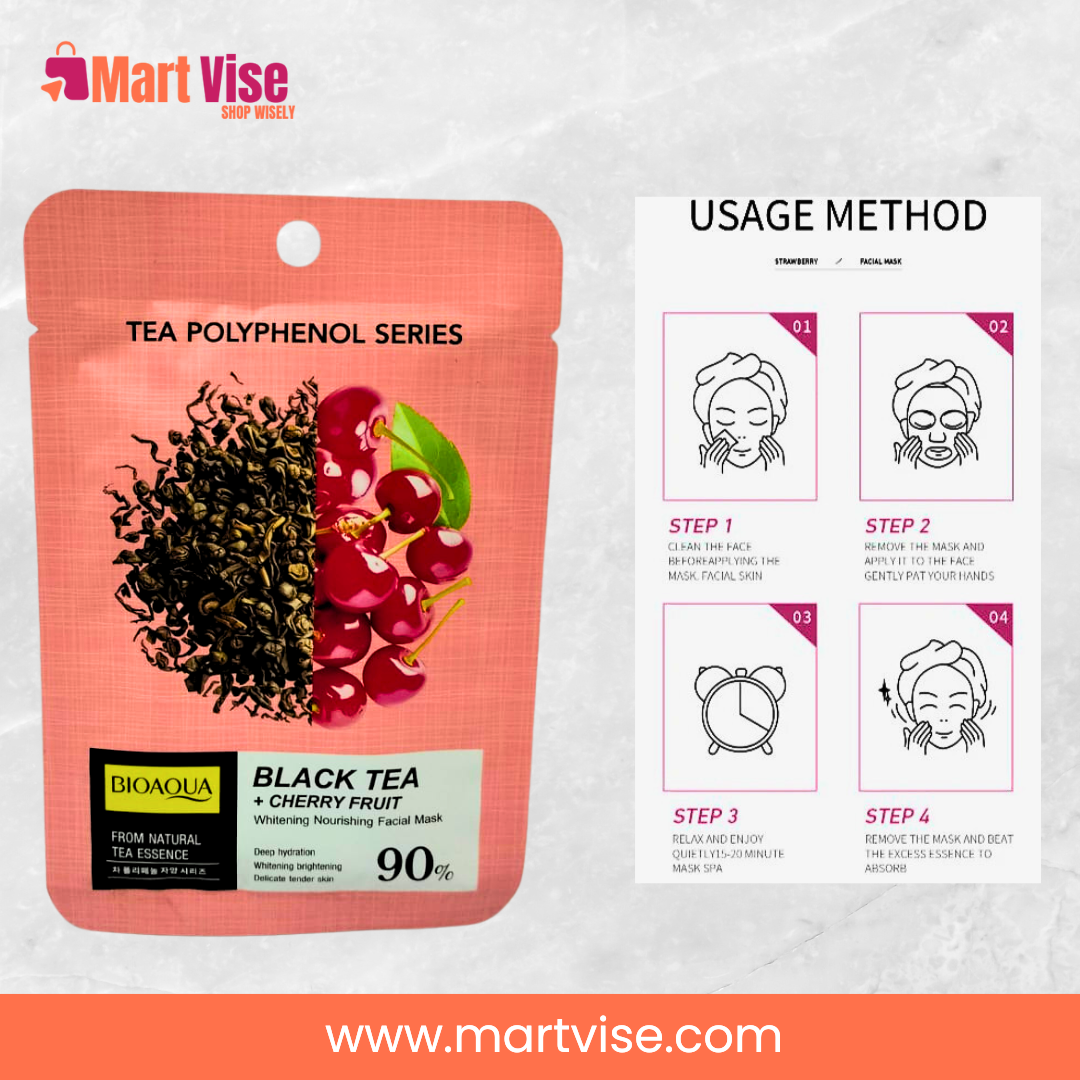 The Bioaqua Black Tea + Cherry Fruit Whitening Nourishing Mask is a powerful skincare sheet mask infused with black tea polyphenols and cherry extract. Designed to deliver deep hydration, whitening, and nourishment, this mask restores brightness and vitality to tired skin. Black tea antioxidants fight dullness and signs of ageing, while cherry fruit provides essential vitamins for hydration and glow. Perfect for Pakistani skin exposed to sun, pollution, and dryness, it helps achieve a refreshed, radiant complexion in just 20 minutes. Ideal for pre-event skincare before weddings, Eid, or everyday glow, this mask combines nature’s best with Korean skincare innovation. With COD availability across Pakistan at an affordable PKR price, Bioaqua Black Tea + Cherry Mask is a must-have for every beauty routine.