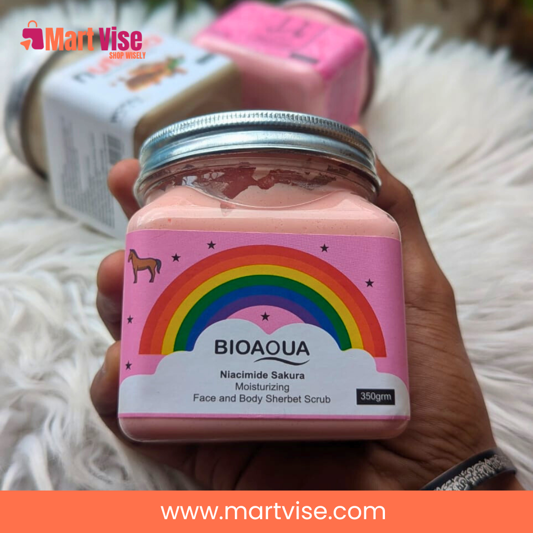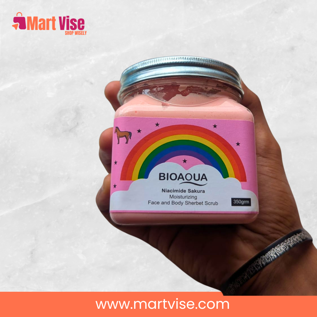 bioaqua body scrub is a creamy sherbet-style exfoliator made to smooth rough texture and give your skin a fresh, polished look. This Niacinamide Sakura Moisturizing Face and Body Sherbet Scrub helps lift away dead skin so your body feels softer and looks brighter—especially on elbows, knees, arms, and heels. If your skin feels dull from Karachi humidity, dusty commutes, or winter dryness in Lahore and Islamabad, bioaqua body scrub fits perfectly into a simple weekly routine.