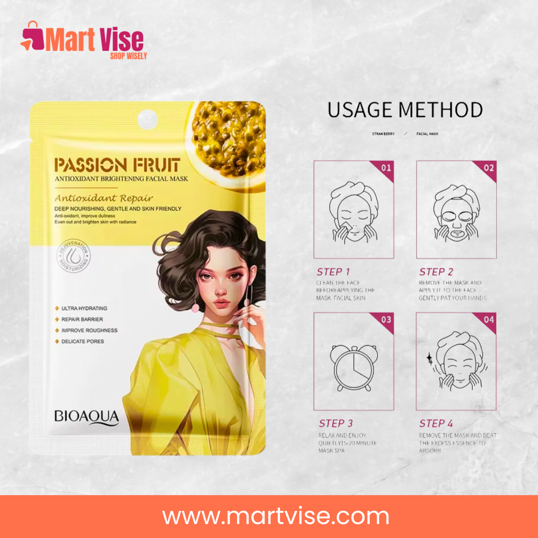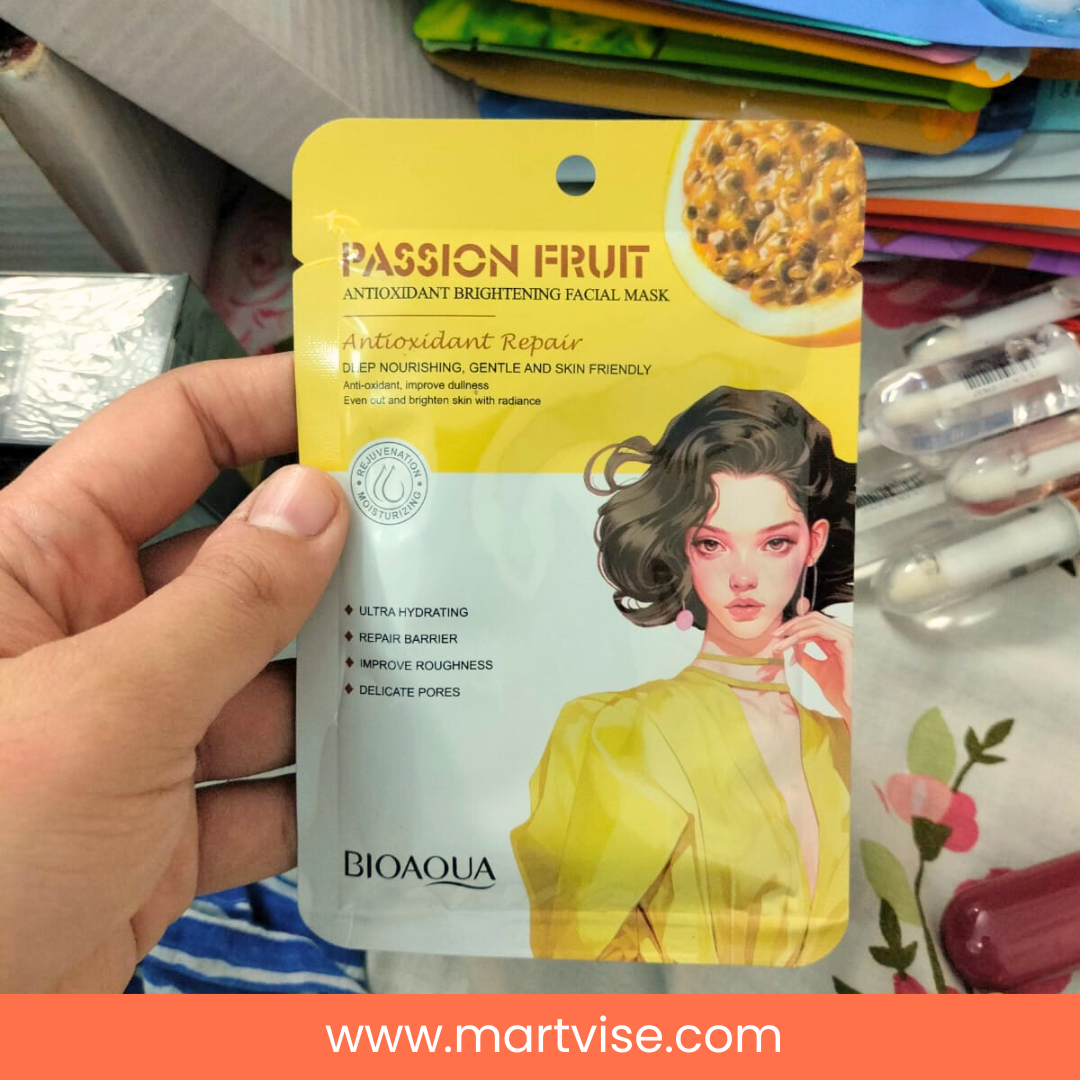 Brighten and revitalize your skin with the BioAqua Passion Fruit Antioxidant Brightening Mask, a skincare essential that combines hydration, nourishment, and radiance. Packed with antioxidant-rich passion fruit extract, this mask helps repair the skin barrier, fight dullness, and restore a youthful glow. Its ultra-hydrating formula soothes dryness while improving skin texture, making it especially effective for Pakistan’s winter season when skin often becomes rough and dehydrated. Designed for all skin types, this sheet mask reduces roughness, firms skin, and brightens complexion in just one application. Whether you are preparing for a wedding, Eid celebration, or simply want to pamper yourself, BioAqua offers an affordable skincare solution with Cash on Delivery and quick delivery all over Pakistan.