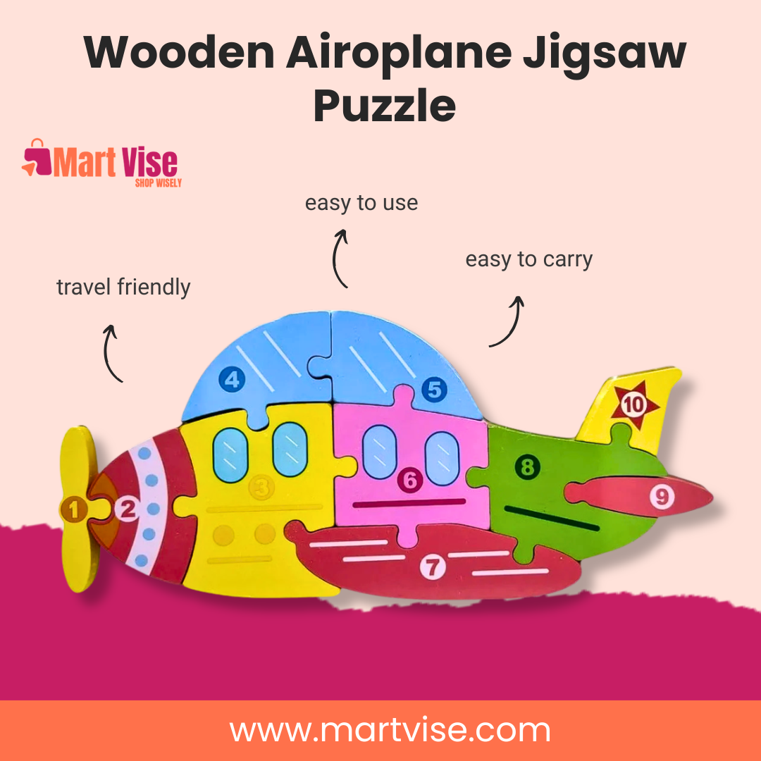 Fun wooden aeroplane jigsaw puzzle for kids in Pakistan. Enhances motor skills, counting, and problem-solving. Safe, colourful, and durable toy.The Wooden Aeroplane Jigsaw Puzzle for Kids is a fun and educational toy designed to boost your child’s early learning and cognitive skills. This bright and engaging aeroplane-themed puzzle helps children learn numbers, colours, and coordination while having fun. Made from high-quality, non-toxic wood, each piece fits perfectly to form a cheerful aeroplane that sparks imagination and curiosity. Ideal for Montessori classrooms or home play, this puzzle keeps your child engaged and improves hand-eye coordination, focus, and memory. Pakistani parents love it for being both safe and educational, helping kids learn through play while staying screen-free. Perfect for gifting on birthdays, Eid, or as a fun learning toy with nationwide COD delivery available in Pakistan.
