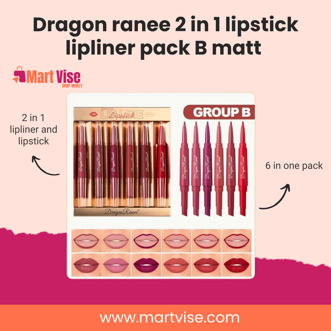 Get ready for bold, defined, and beautiful lips with the Dragon Ranee 2 in 1 Lipstick & Lipliner Pack B! This dual-ended lip crayon combines the precision of a lipliner with the richness of a matte lipstick, giving you smooth application and full coverage. Featuring 6 flattering shades in one pack, it’s ideal for every mood — from soft nude to classic red.