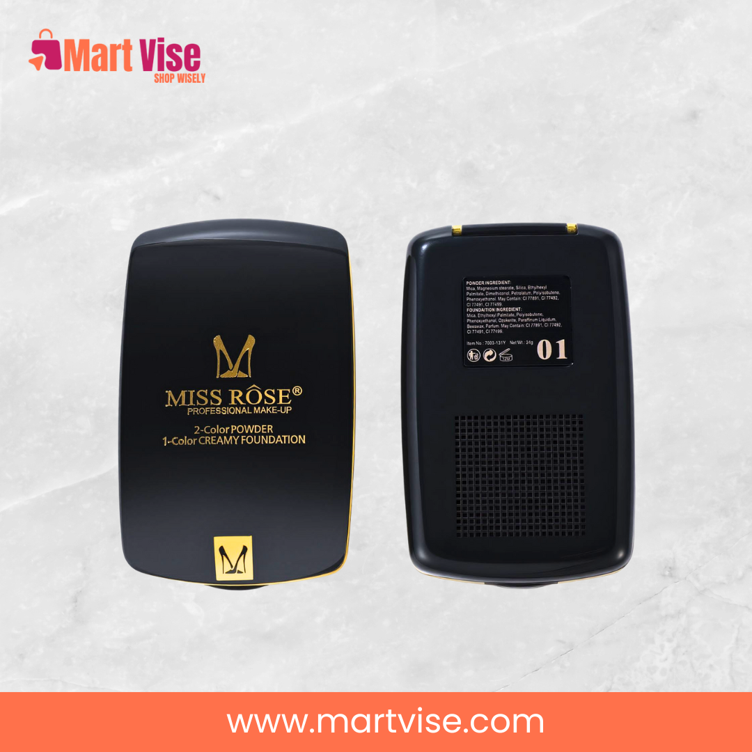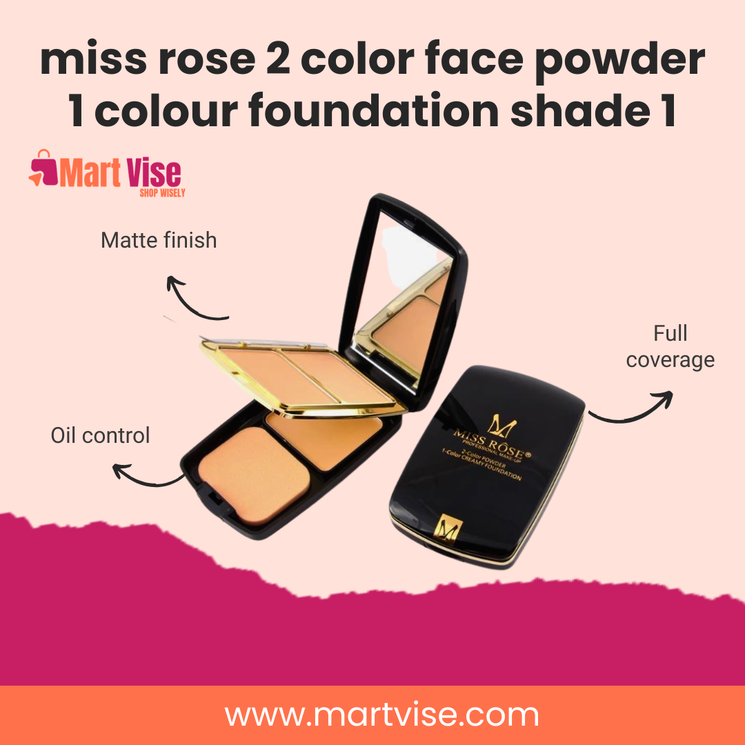 Get the perfect matte, long-lasting look with Miss Rose 3 in 1 Foundation & Setting Powder Shade 1 – your complete base makeup solution in one compact. This versatile product acts as a foundation, face powder, and setting powder, giving you a flawless complexion with minimal effort. Designed for Pakistan’s warm, humid weather, its oil-control formula helps reduce shine while keeping your makeup intact all day. Shade 1 offers natural coverage ideal for fair to medium Pakistani skin tones, blending seamlessly to even out complexion without a heavy feel. Whether you’re heading to work, college, or a party, this compact gives you smooth, breathable coverage that lasts. It includes a built-in mirror and sponge applicator, perfect for on-the-go touch-ups. Shop Miss Rose 3 in 1 Foundation/Setting Powder exclusively from MartVise, with cash on delivery (COD) available nationwide in Pakistan.