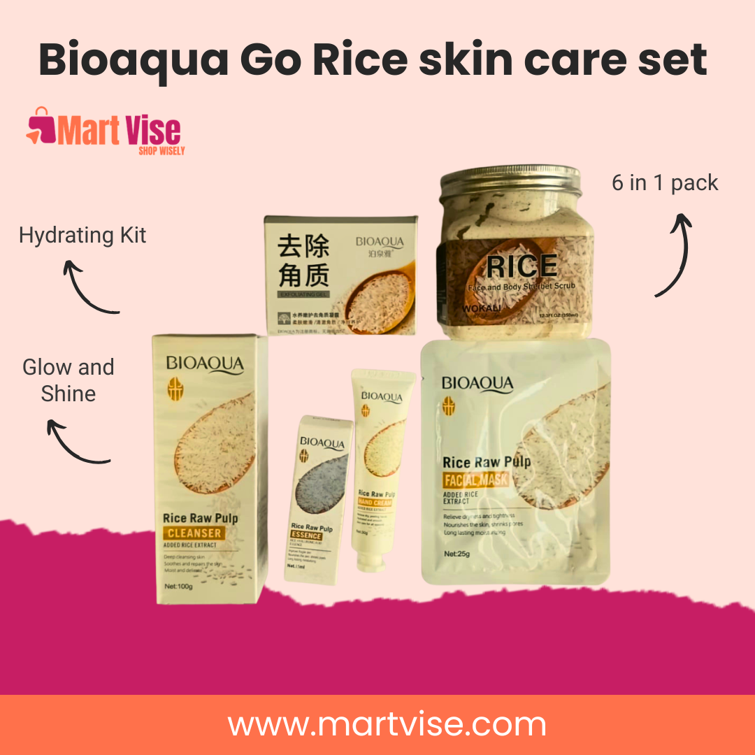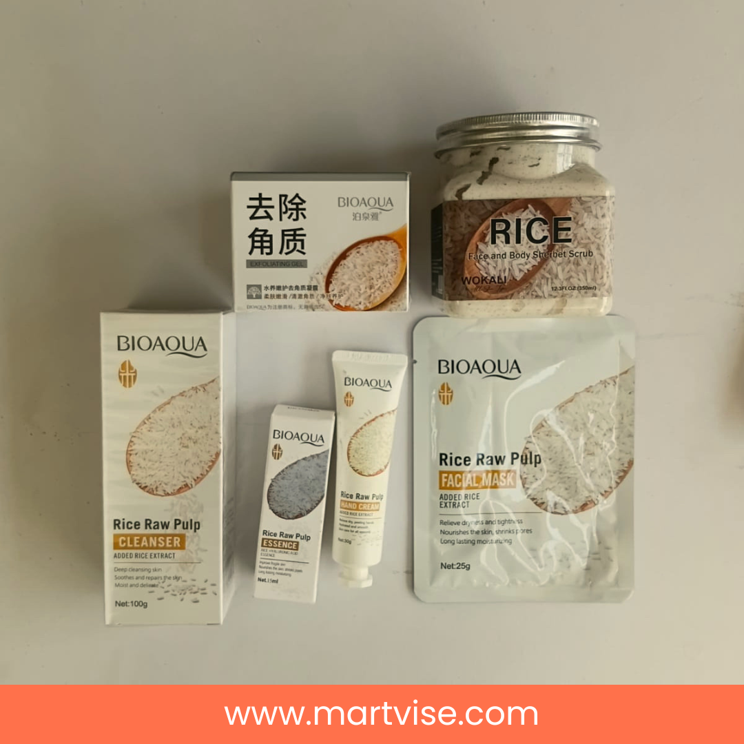 The set is built around BIOAQUA Rice Raw Pulp essentials—cleanser, essence, and facial mask—plus extra care items like an exfoliating gel, a rice face-and-body scrub, and a rice hand cream. Use it as a simple weekly reset before Eid, daawats, and wedding events, or as your everyday routine to keep skin comfortable and makeup-friendly. With regular use, you’ll notice smoother texture, a more hydrated feel, and that clean, polished look people often call “glass skin”.